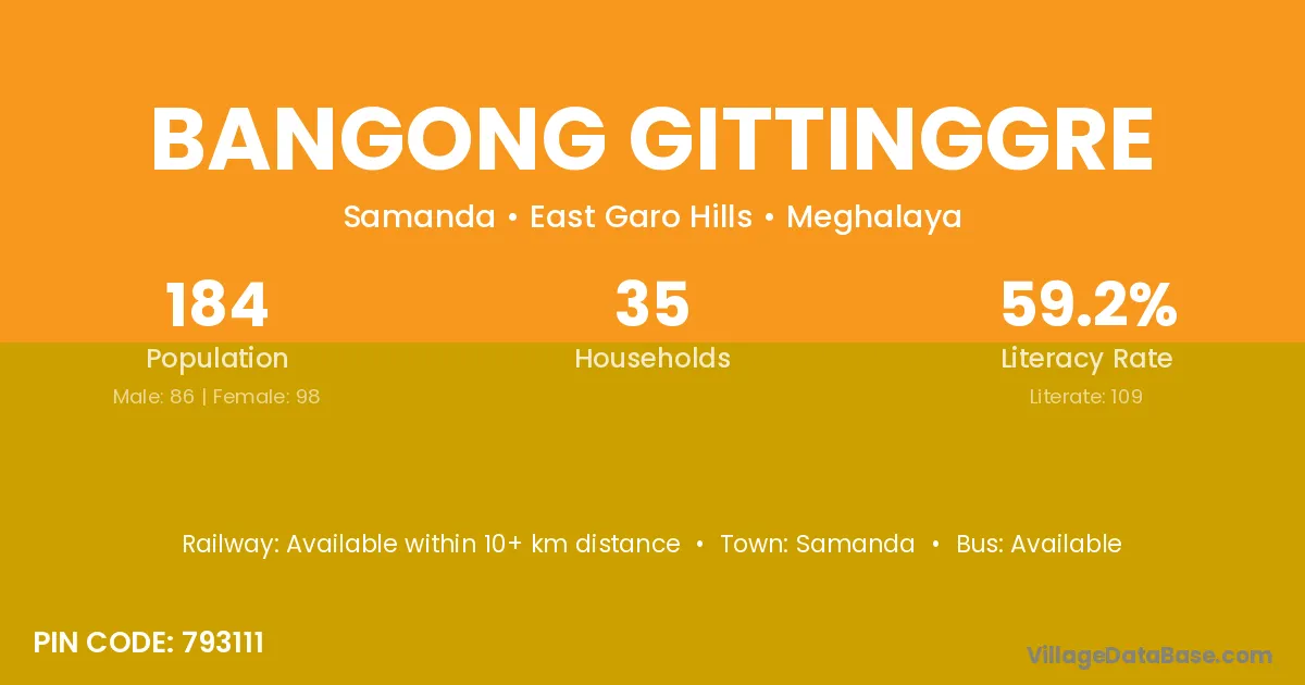 Bangong Gittinggre village has a total population of 184 people, of which 86 are males and 98 are females.