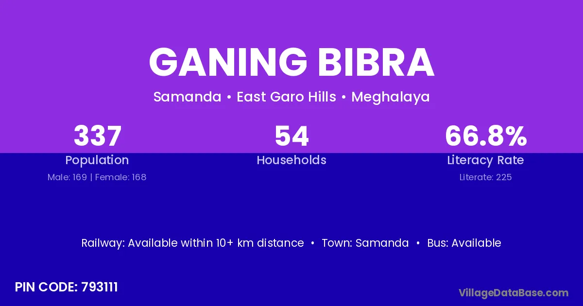 Ganing Bibra village has a total population of 337 people, of which 169 are males and 168 are females.