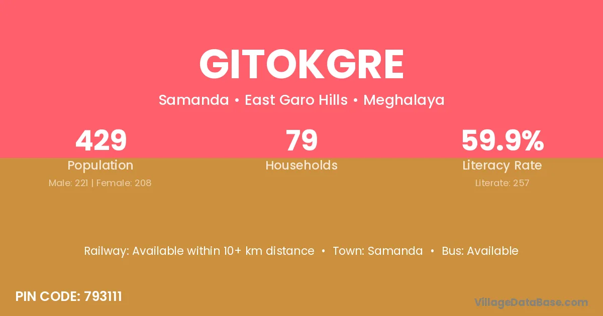 Gitokgre village has a total population of 429 people, of which 221 are males and 208 are females.