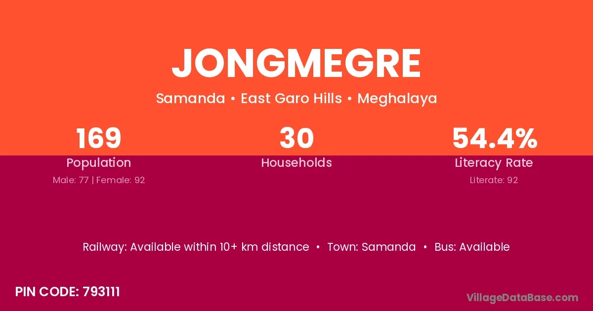 Jongmegre village has a total population of 169 people, of which 77 are males and 92 are females.
