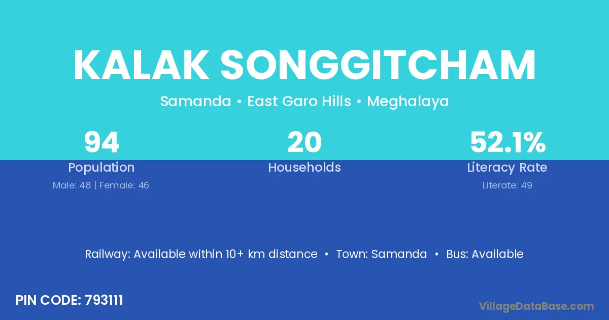 Kalak Songgitcham village has a total population of 94 people, of which 48 are males and 46 are females.