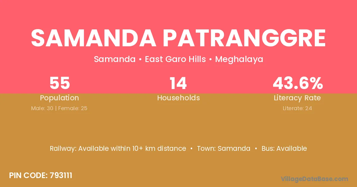 Samanda Patranggre village has a total population of 55 people, of which 30 are males and 25 are females.