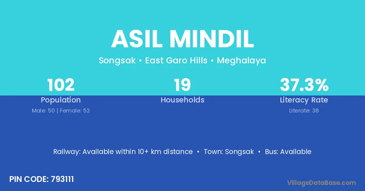 The literacy rate of Asil Mindil village is 37.25%. Male literacy stands at 48.00% and female literacy at 26.92%.