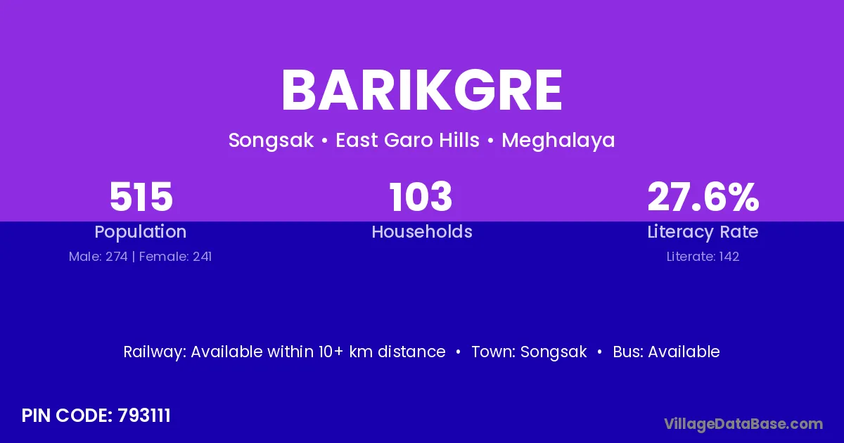 According to Census 2011 information, the village code of Barikgre village is 793111.