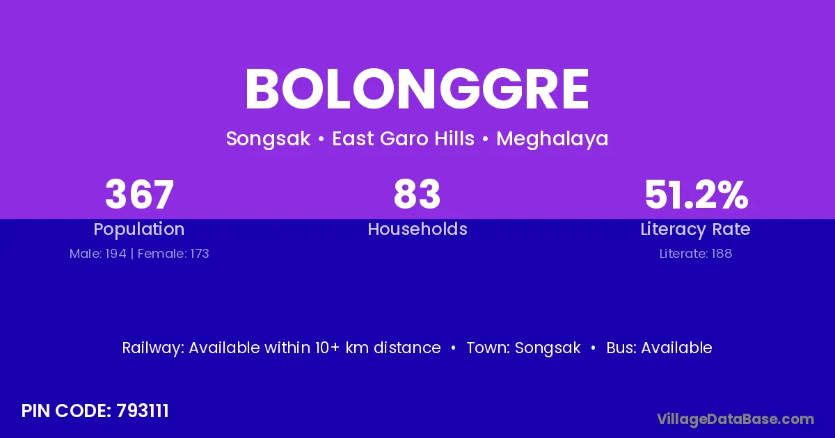 Bolonggre village has a total population of 367 people, of which 194 are males and 173 are females.
