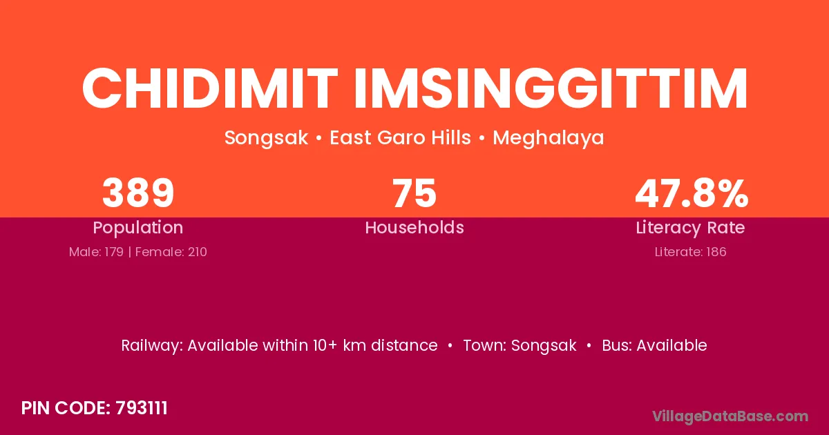 Chidimit Imsinggittim village has a total population of 389 people, of which 179 are males and 210 are females.