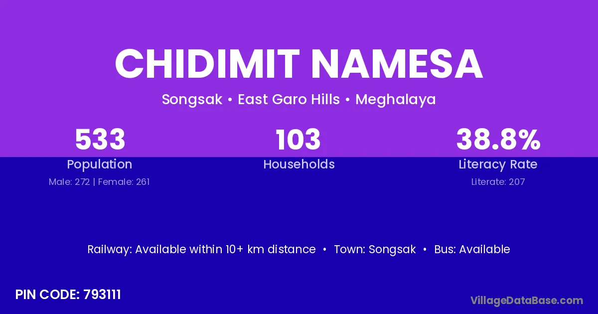 Chidimit Namesa village has a total population of 533 people, of which 272 are males and 261 are females.