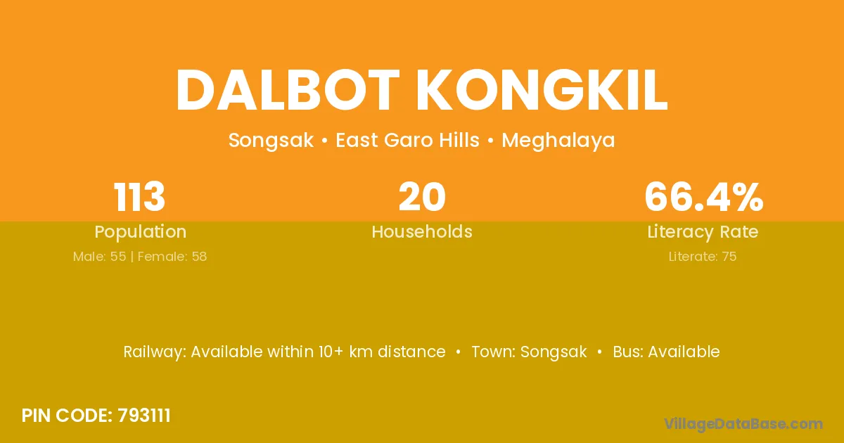 Dalbot Kongkil village has a total population of 113 people, of which 55 are males and 58 are females.