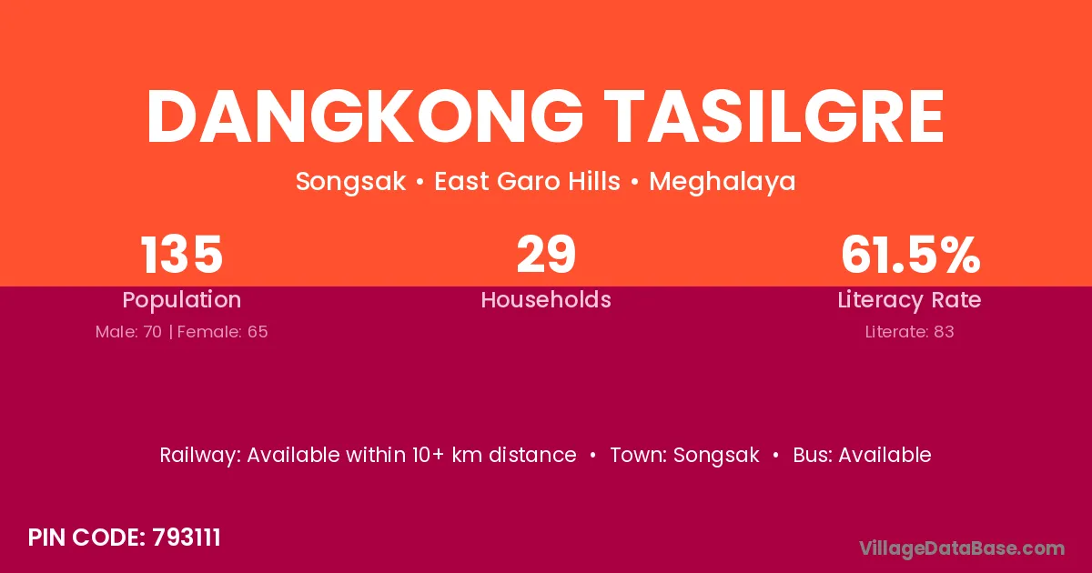 Dangkong Tasilgre village has a total population of 135 people, of which 70 are males and 65 are females.