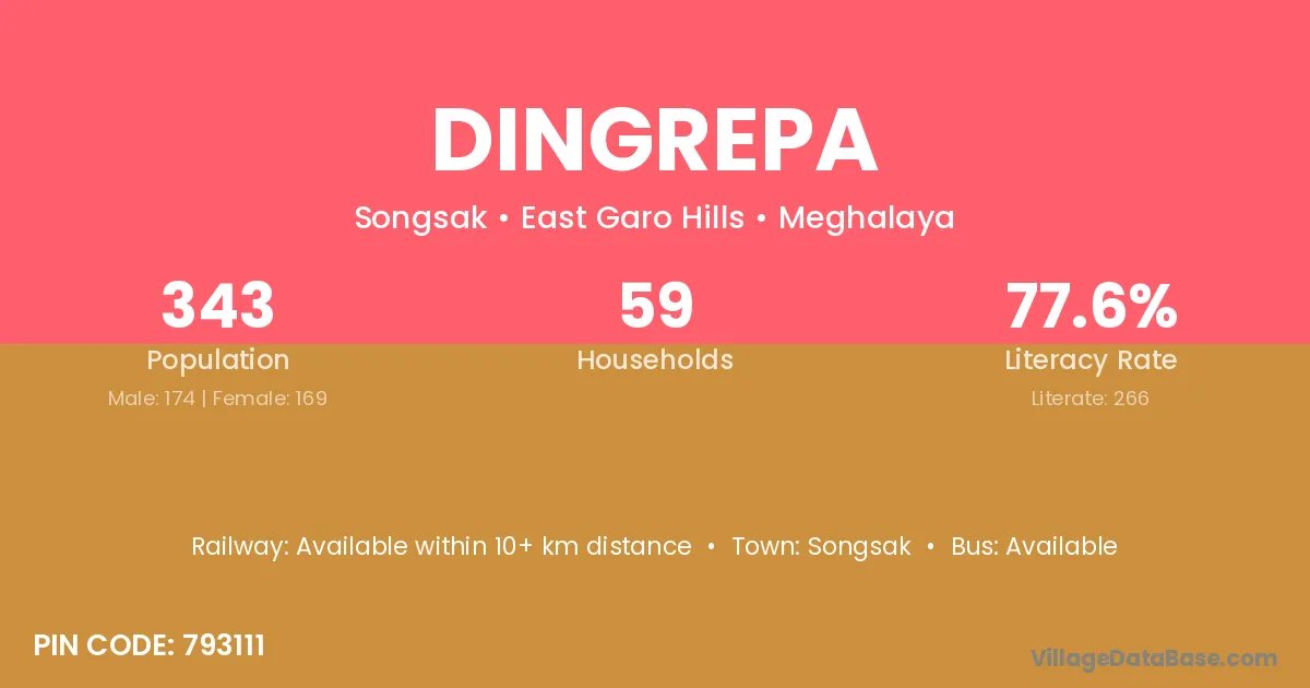 Dingrepa village has a total population of 343 people, of which 174 are males and 169 are females.