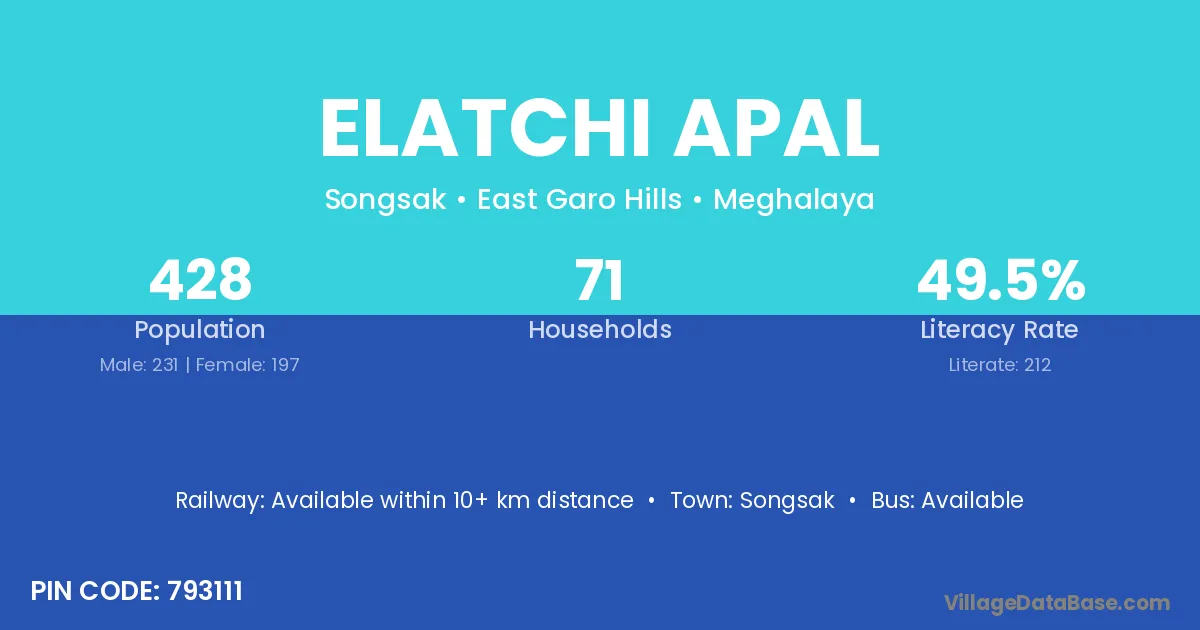 Elatchi Apal village has a total population of 428 people, of which 231 are males and 197 are females.