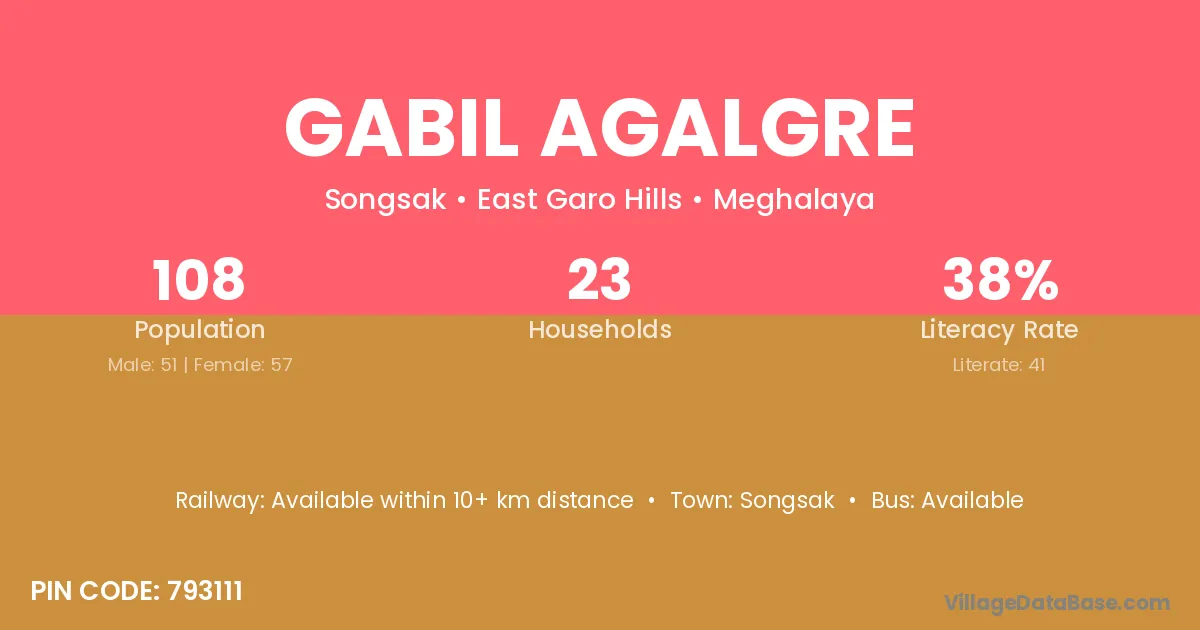 The literacy rate of Gabil Agalgre village is 37.96%. Male literacy stands at 45.10% and female literacy at 31.58%.