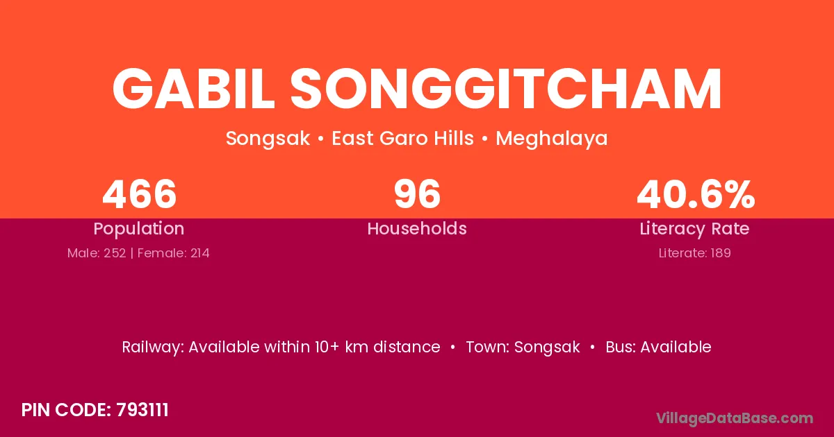 Gabil Songgitcham village has a total population of 466 people, of which 252 are males and 214 are females.