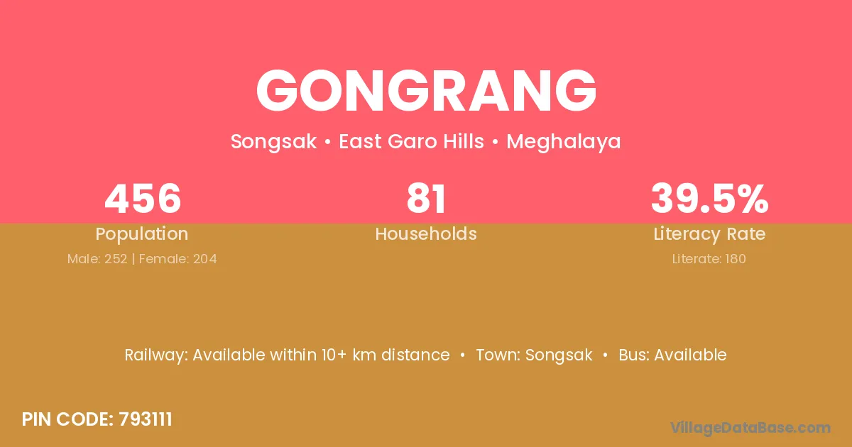 Gongrang village has a total population of 456 people, of which 252 are males and 204 are females.