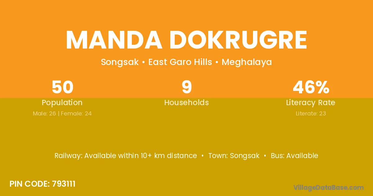 The literacy rate of Manda Dokrugre village is 46.00%. Male literacy stands at 61.54% and female literacy at 29.17%.