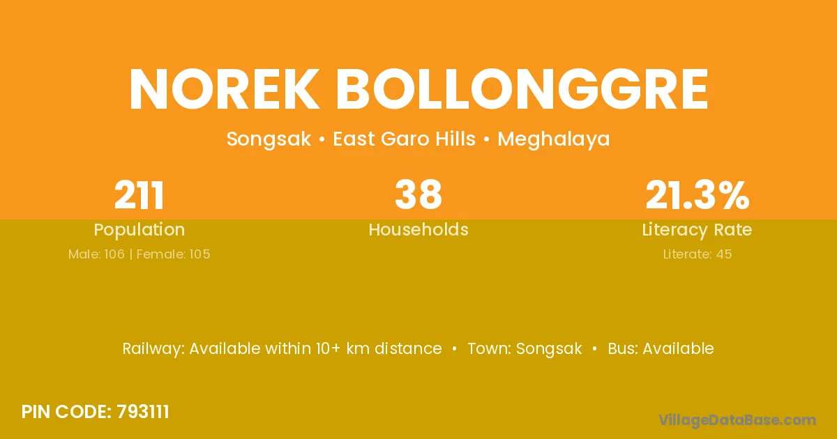 The literacy rate of Norek Bollonggre village is 21.33%. Male literacy stands at 16.04% and female literacy at 26.67%.
