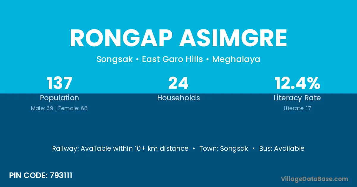The literacy rate of Rongap Asimgre village is 12.41%. Male literacy stands at 11.59% and female literacy at 13.24%.