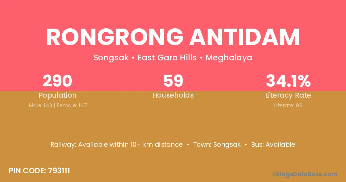 Rongrong Antidam village has a total population of 290 people, of which 143 are males and 147 are females.