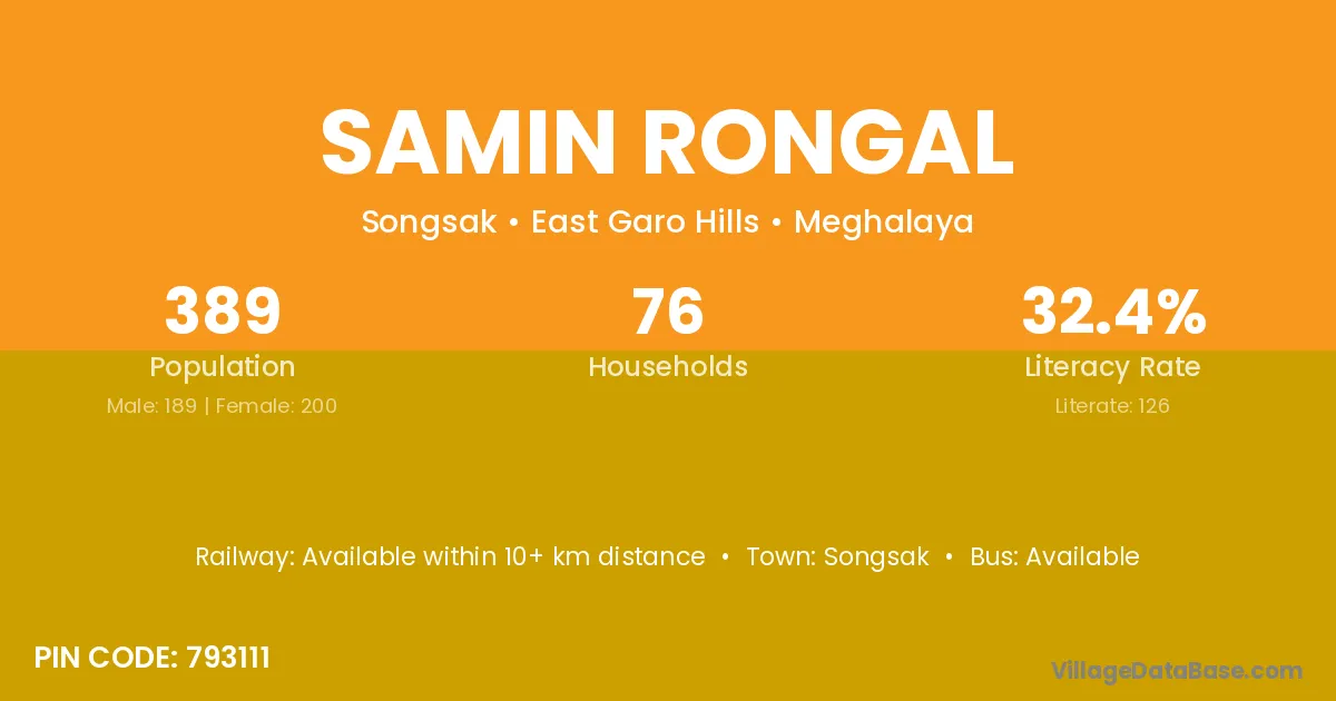 Samin Rongal village has a total population of 389 people, of which 189 are males and 200 are females.