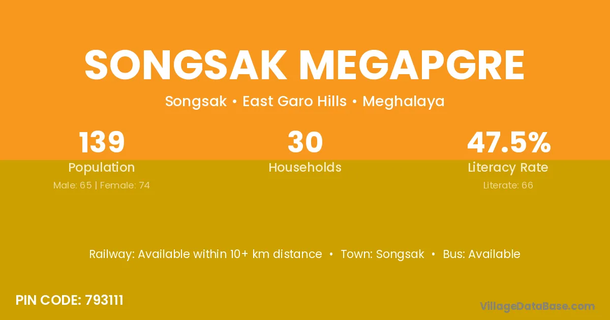 Songsak Megapgre village is located in the Songsak Subdivision of the East Garo Hills district in Meghalaya .