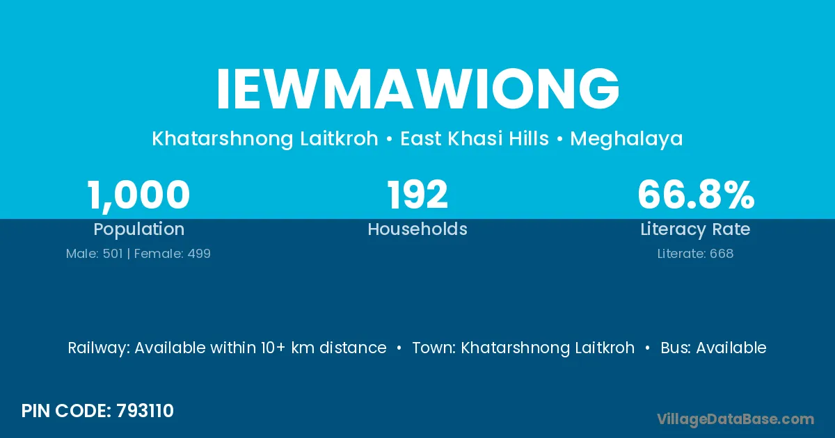 Iewmawiong village has a total population of 1,000 people, of which 501 are males and 499 are females.