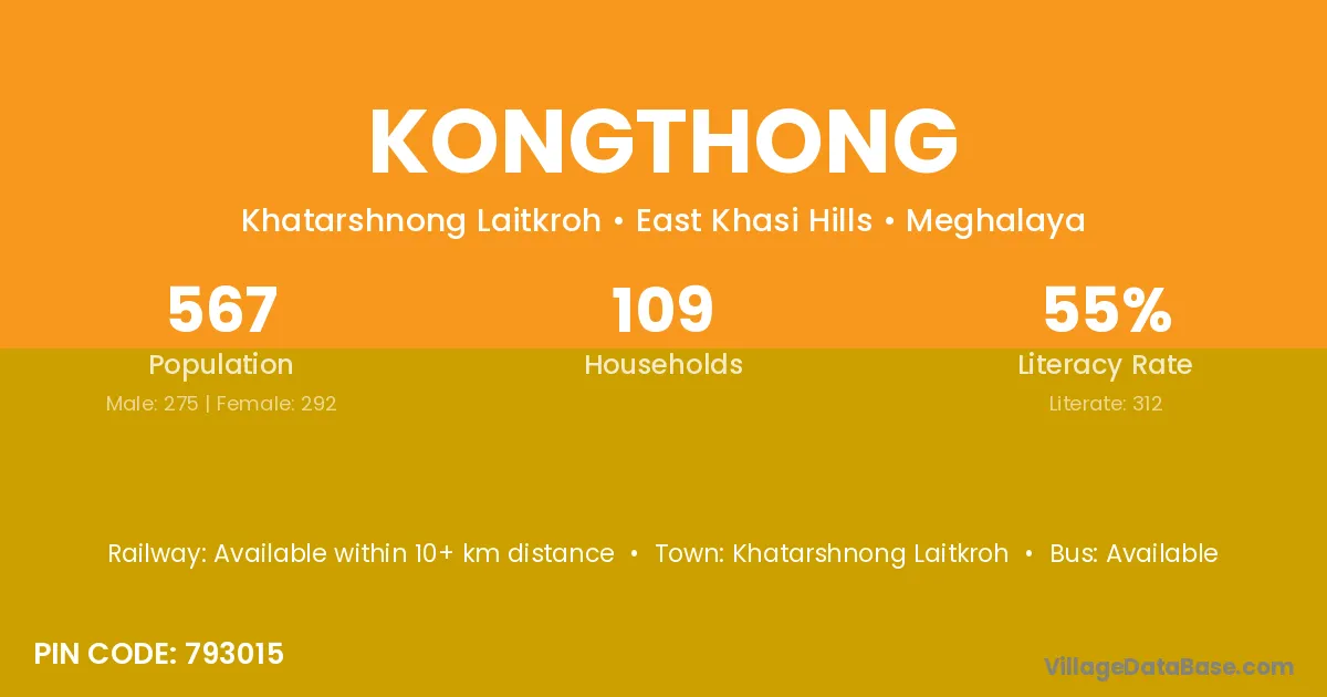 The literacy rate of Kongthong village is 55.03%. Male literacy stands at 48.73% and female literacy at 60.96%.