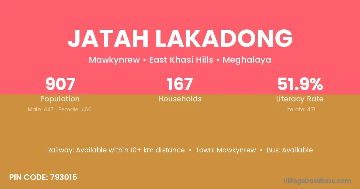 Jatah Lakadong village has a total population of 907 people, of which 447 are males and 460 are females.