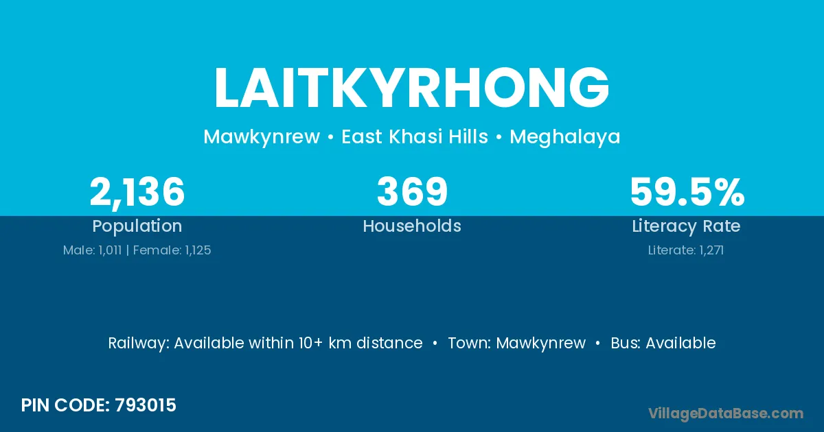 The literacy rate of Laitkyrhong village is 59.50%. Male literacy stands at 59.05% and female literacy at 59.91%.