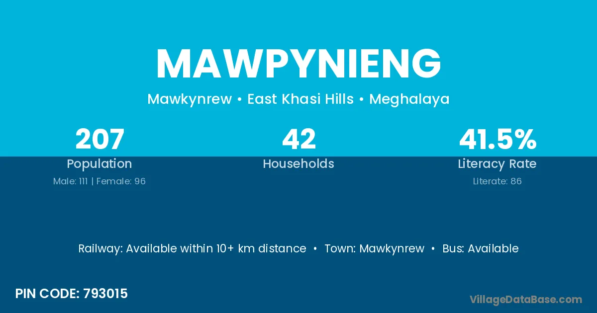 Mawpynieng village has a total population of 207 people, of which 111 are males and 96 are females.