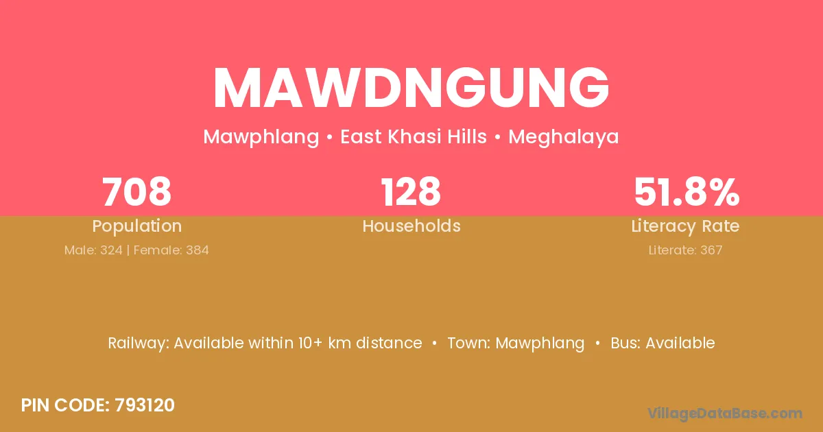 Mawdngung village has a total population of 708 people, of which 324 are males and 384 are females.