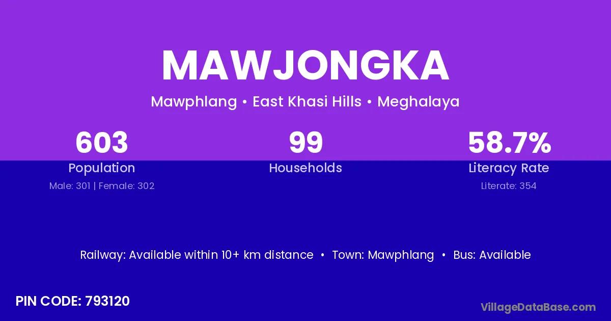 Mawjongka village has a total population of 603 people, of which 301 are males and 302 are females.