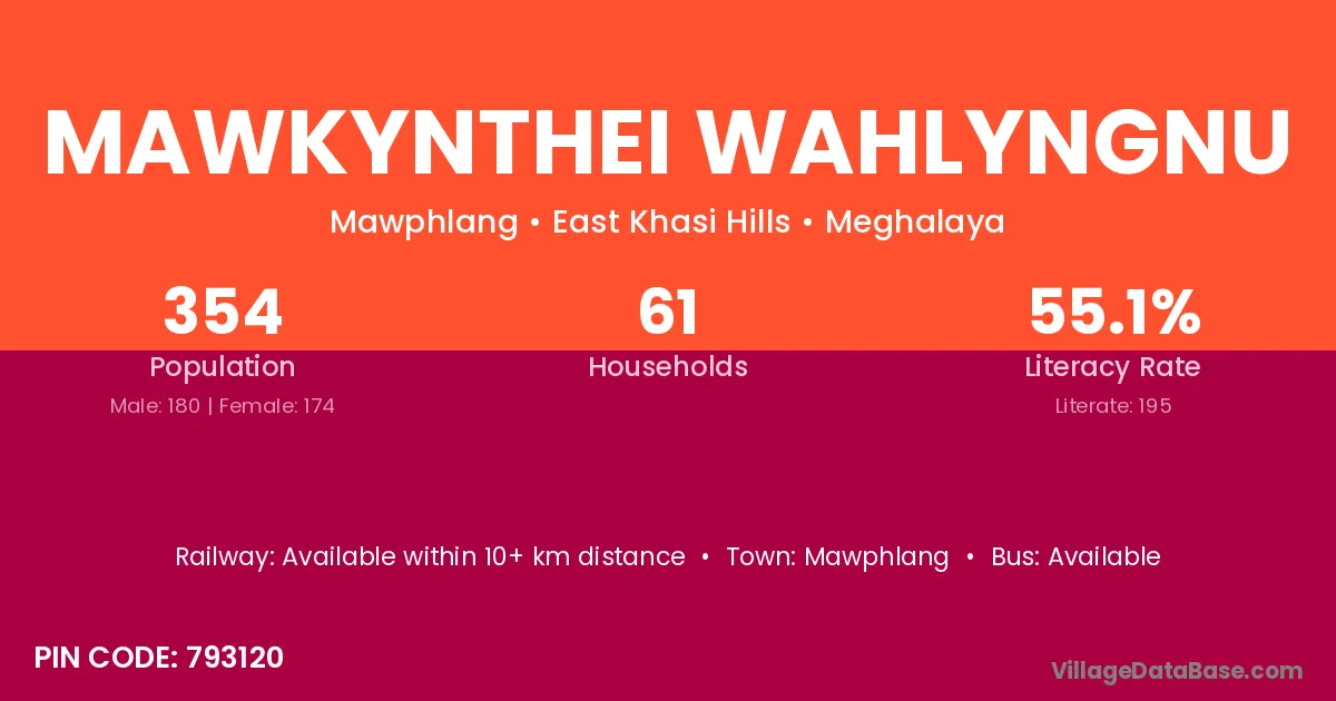 Mawkynthei Wahlyngnu village has a total population of 354 people, of which 180 are males and 174 are females.