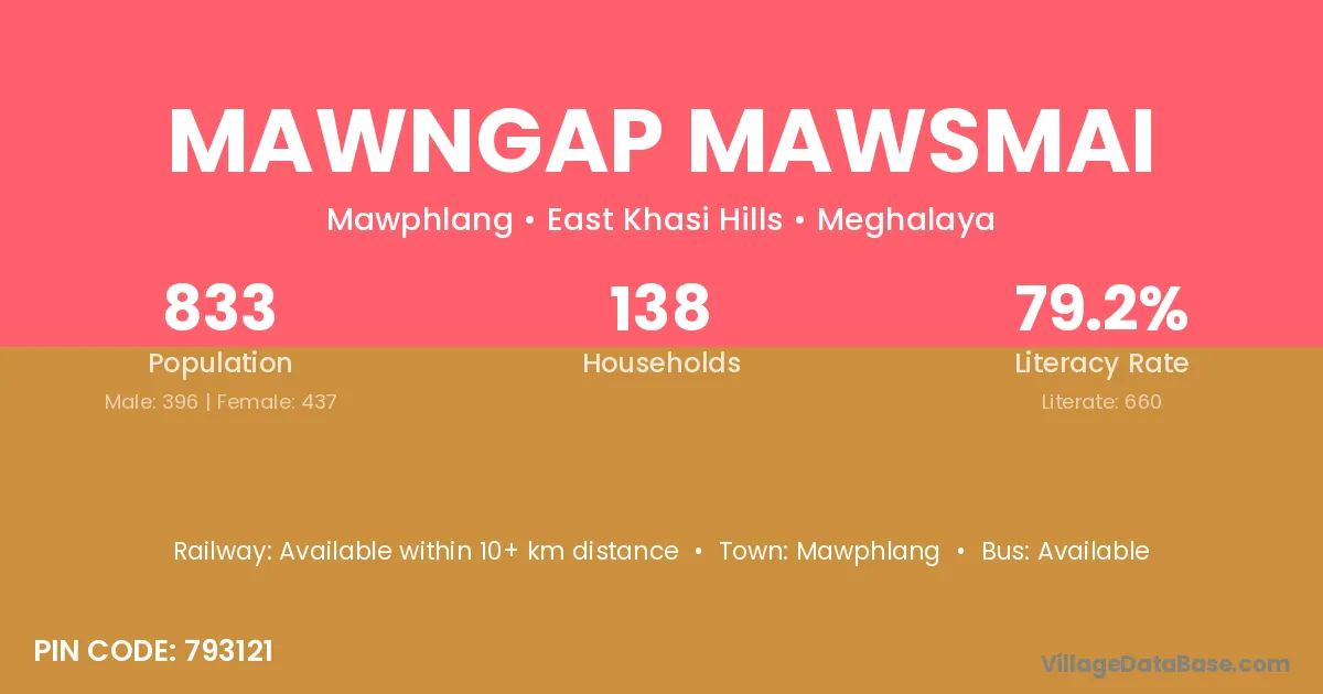 Mawngap Mawsmai village has a total population of 833 people, of which 396 are males and 437 are females.
