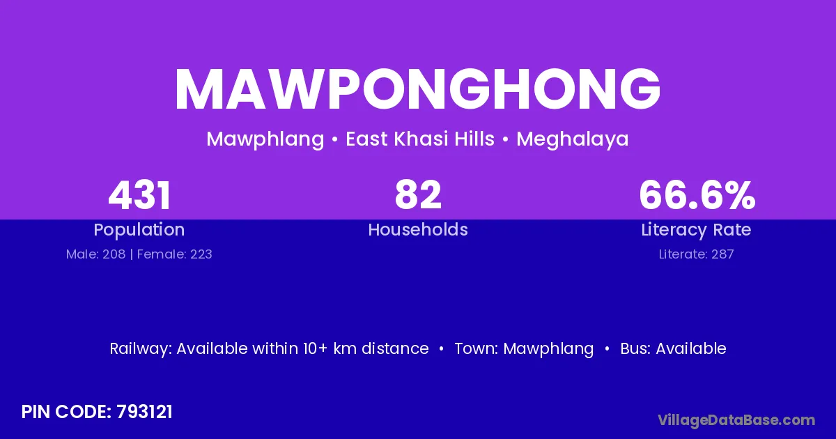 Mawponghong village has a total population of 431 people, of which 208 are males and 223 are females.
