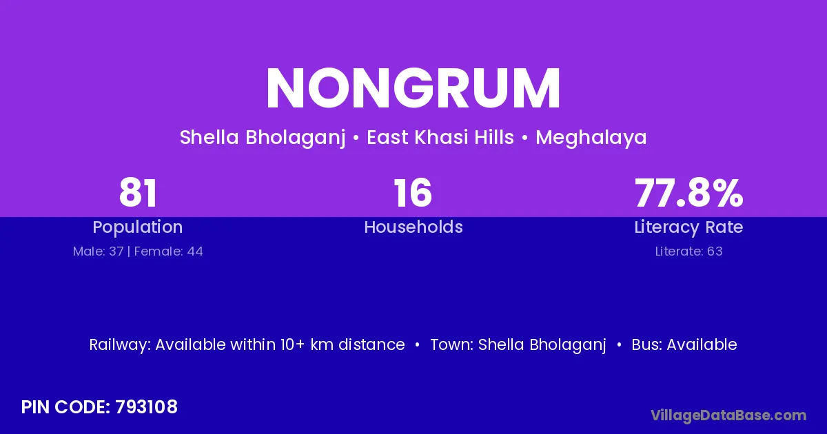 The literacy rate of Nongrum village is 78.32%. Male literacy stands at 77.67% and female literacy at 78.95%.