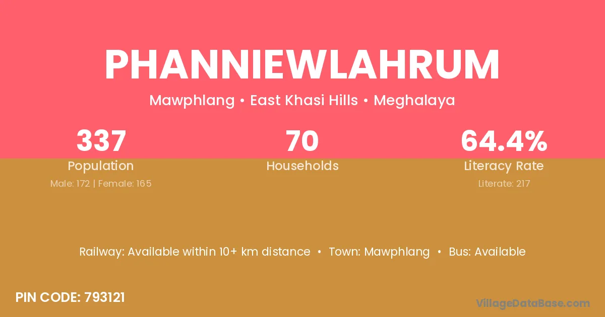Phanniewlahrum village has a total population of 337 people, of which 172 are males and 165 are females.