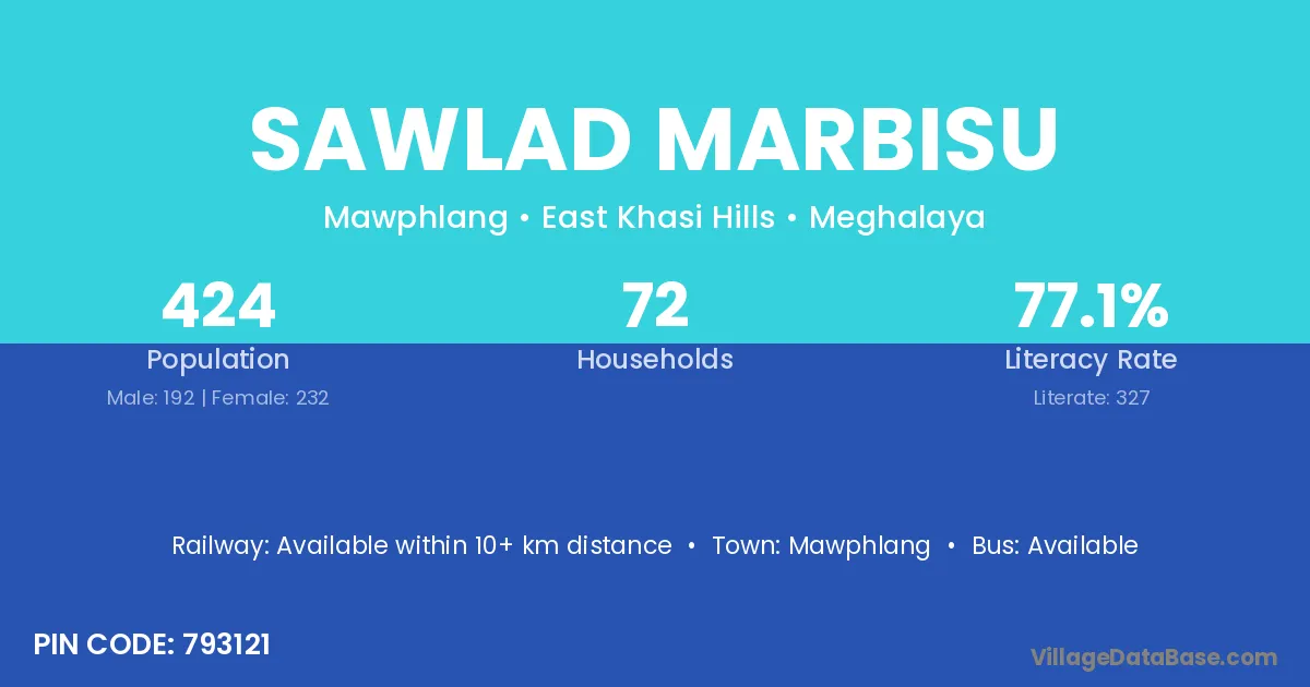 Sawlad Marbisu village has a total population of 424 people, of which 192 are males and 232 are females.