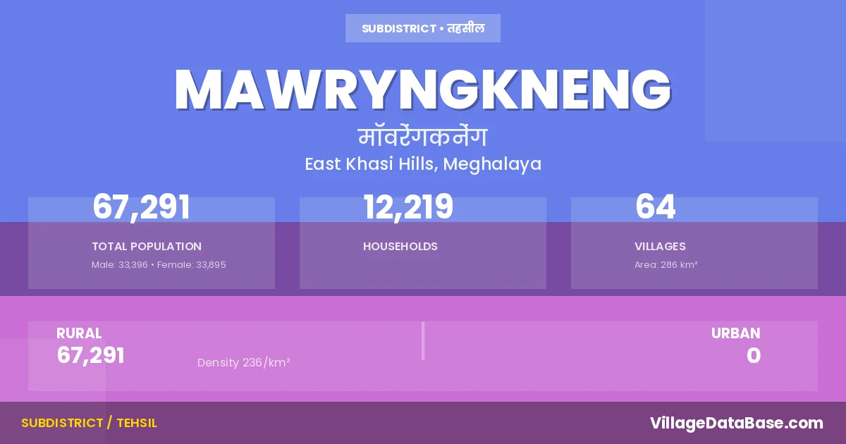 According to the 2011 census The total area of Mawryngkneng Subdivision is 286 km², with a population of 67291 people. The population density is 236 inhabitants per square kilometre, and there are approximately 12219 houses in the sub district.