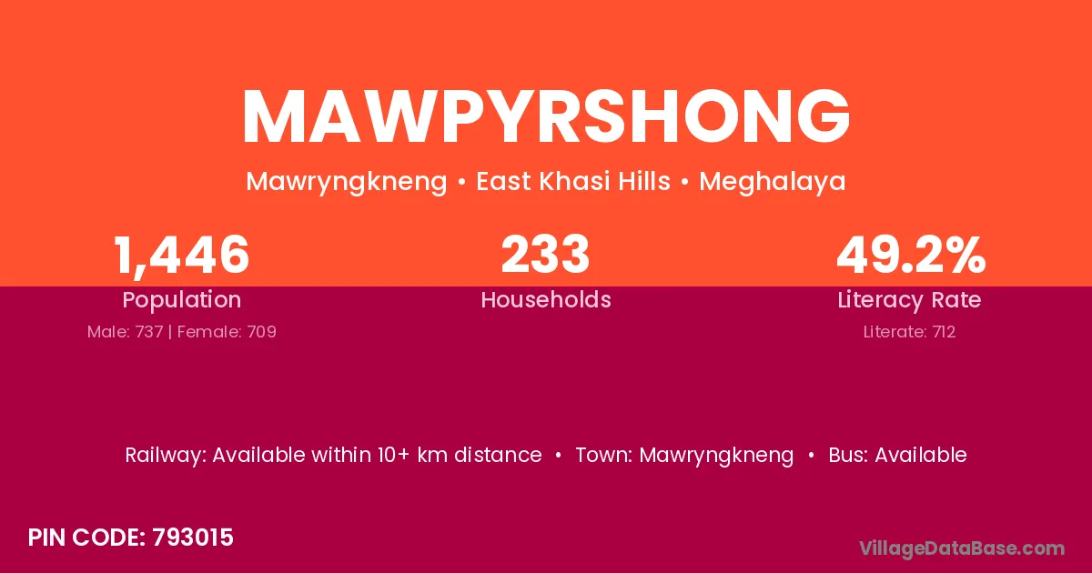 Mawpyrshong village has a total population of 1,446 people, of which 737 are males and 709 are females.