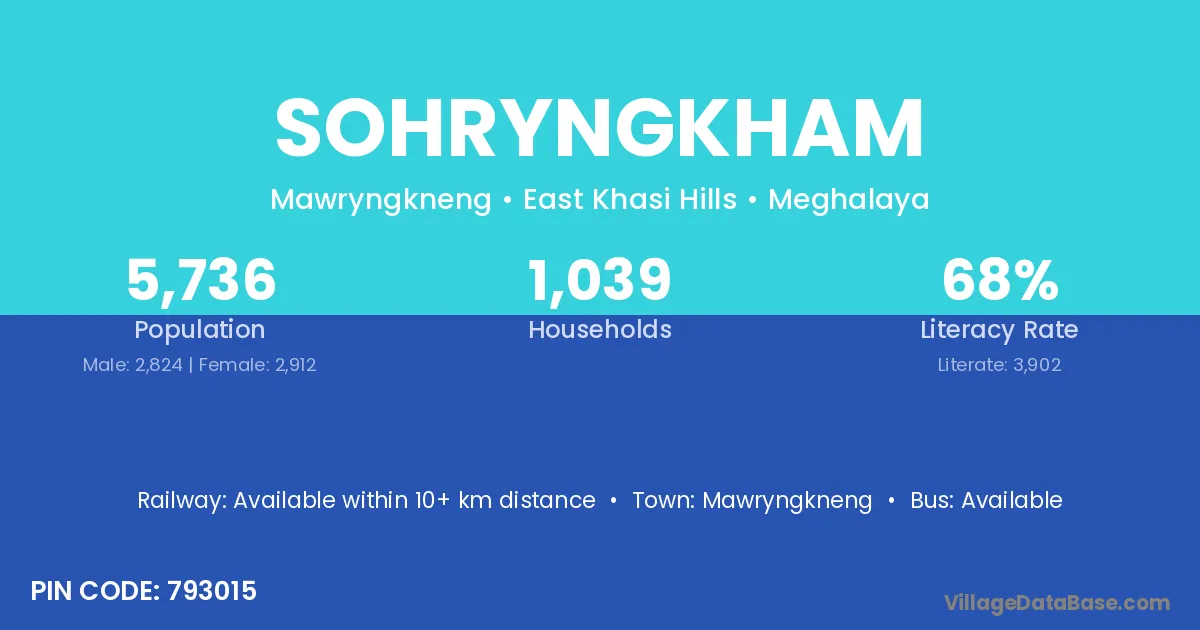 Sohryngkham village has a total population of 5,736 people, of which 2,824 are males and 2,912 are females.