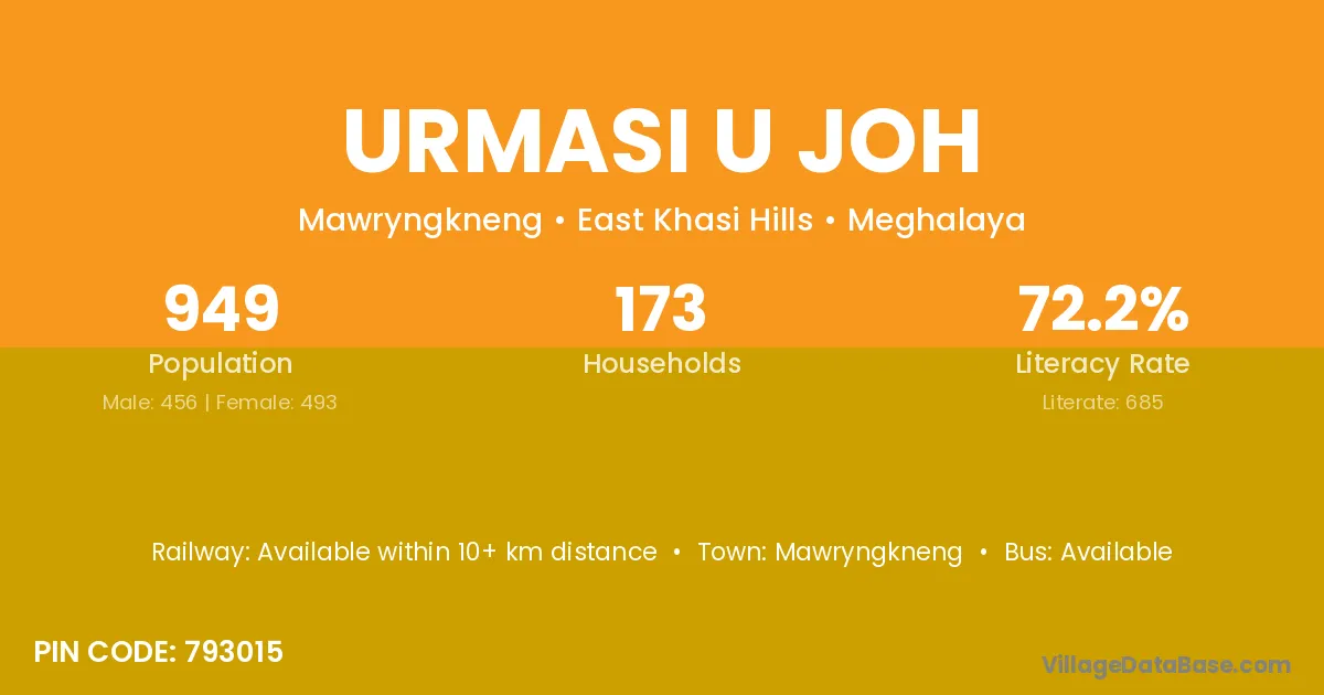 Urmasi U Joh village has a total population of 949 people, of which 456 are males and 493 are females.