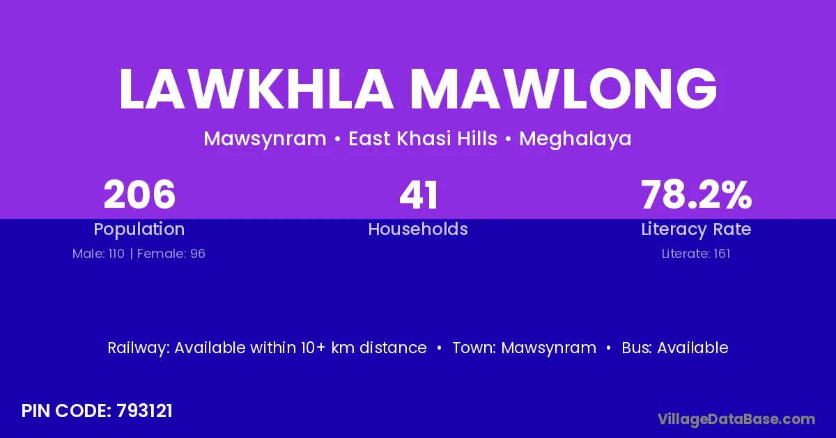 The literacy rate of Lawkhla Mawlong village is 78.16%. Male literacy stands at 76.36% and female literacy at 80.21%.