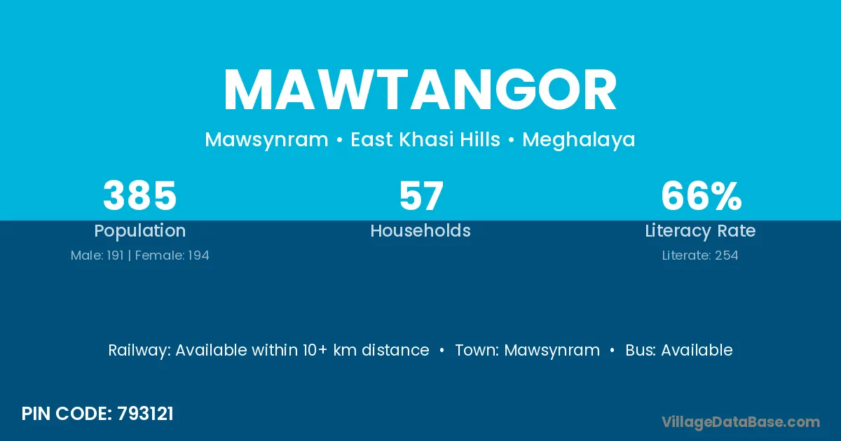 Mawtangor village has a total population of 385 people, of which 191 are males and 194 are females.