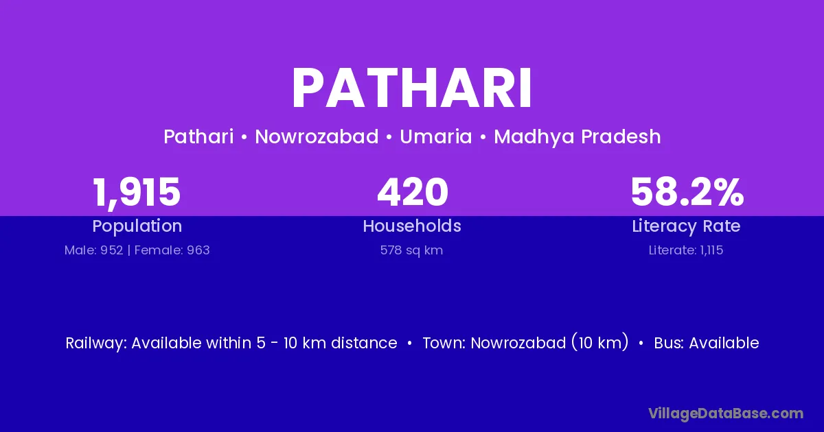 The literacy rate of Pathari village is 53.30%. Male literacy stands at 63.27% and female literacy at 43.43%.