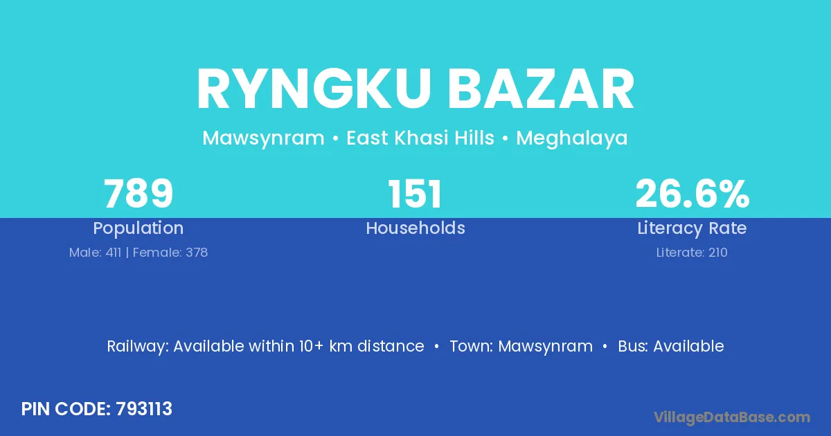 Ryngku Bazar village has a total population of 789 people, of which 411 are males and 378 are females.