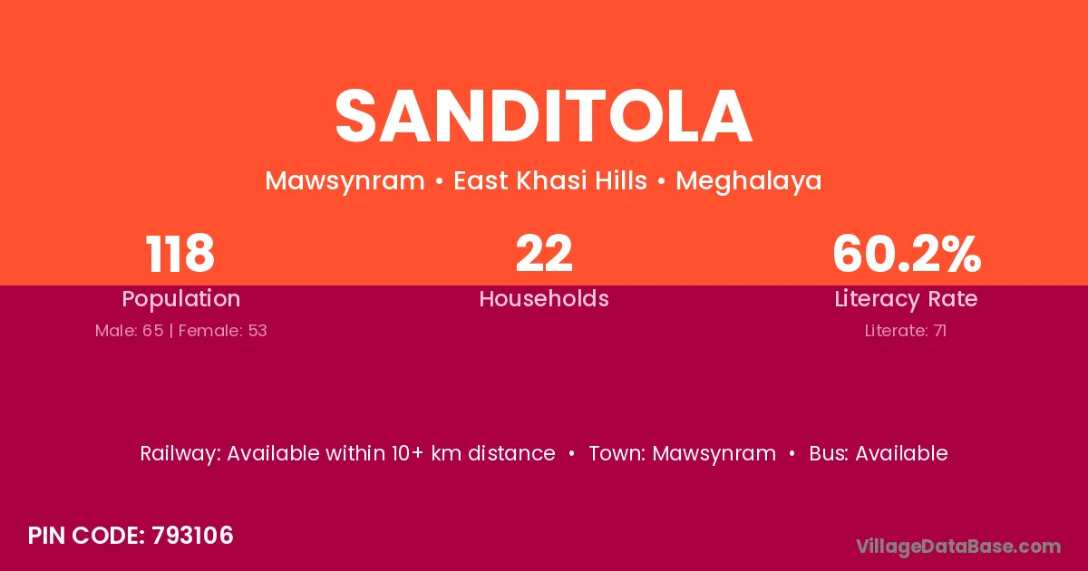 Sanditola village has a total population of 118 people, of which 65 are males and 53 are females.