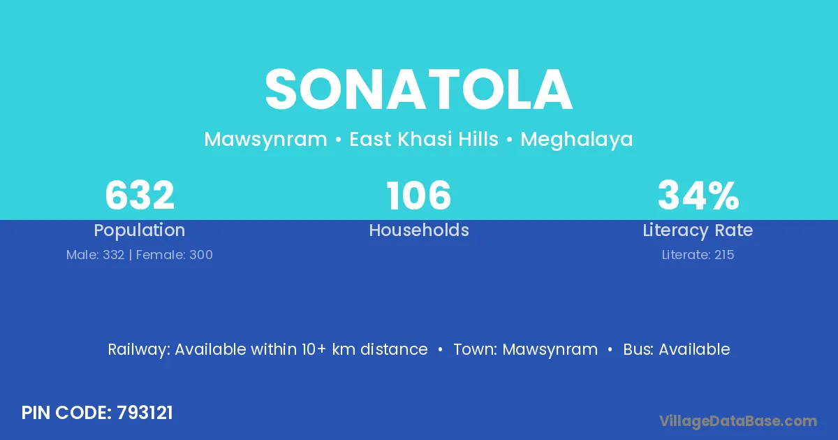 Mawsynram is the nearest town to Sonatola village for major economic activities