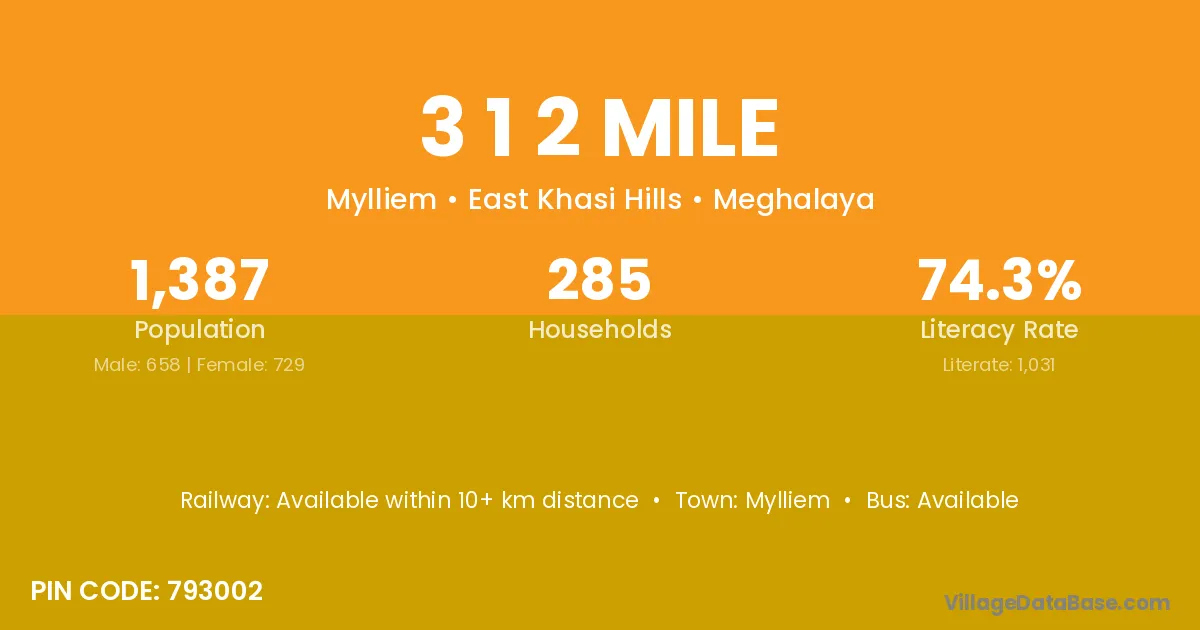 3 1 2 Mile village has a total population of 1,387 people, of which 658 are males and 729 are females.
