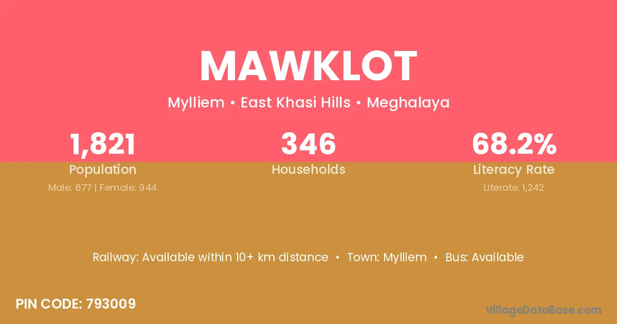 Mawklot village has a total population of 1,821 people, of which 877 are males and 944 are females.