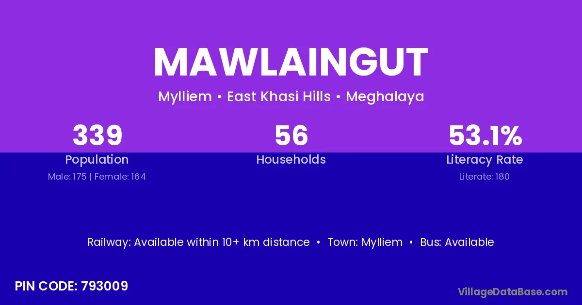 Mawlaingut village has a total population of 339 people, of which 175 are males and 164 are females.